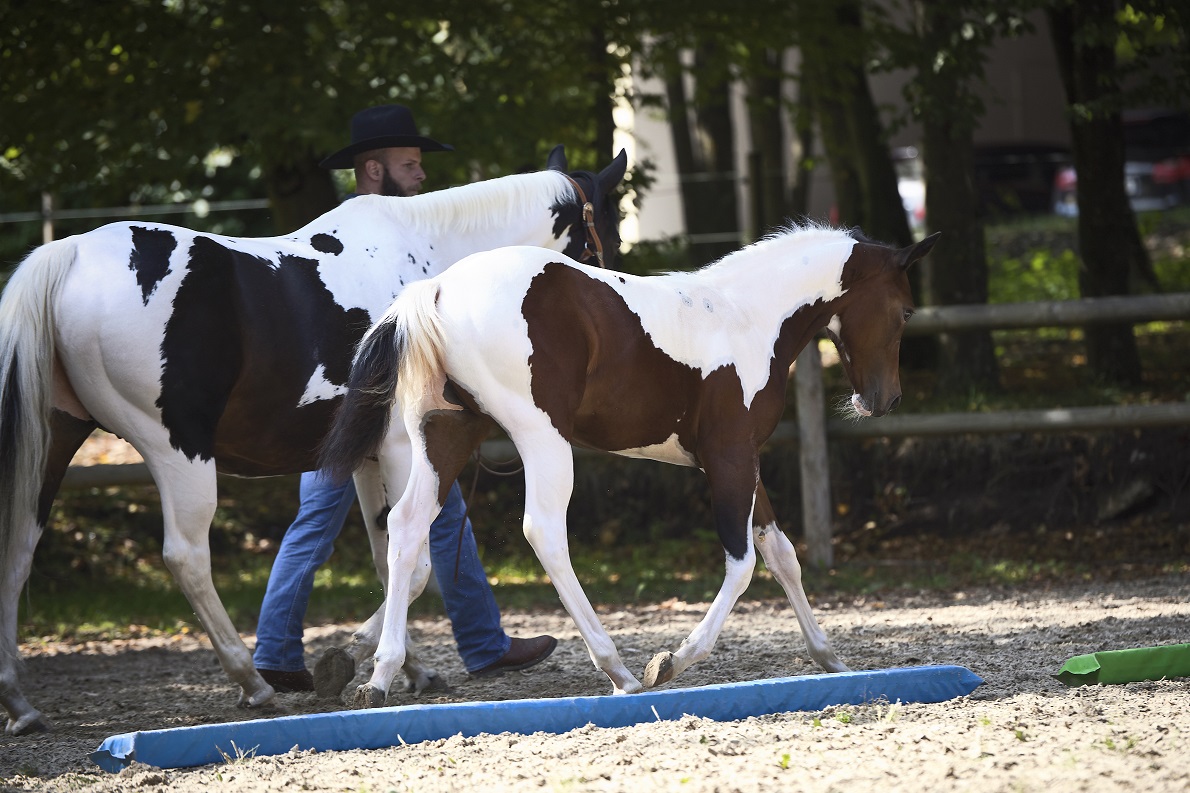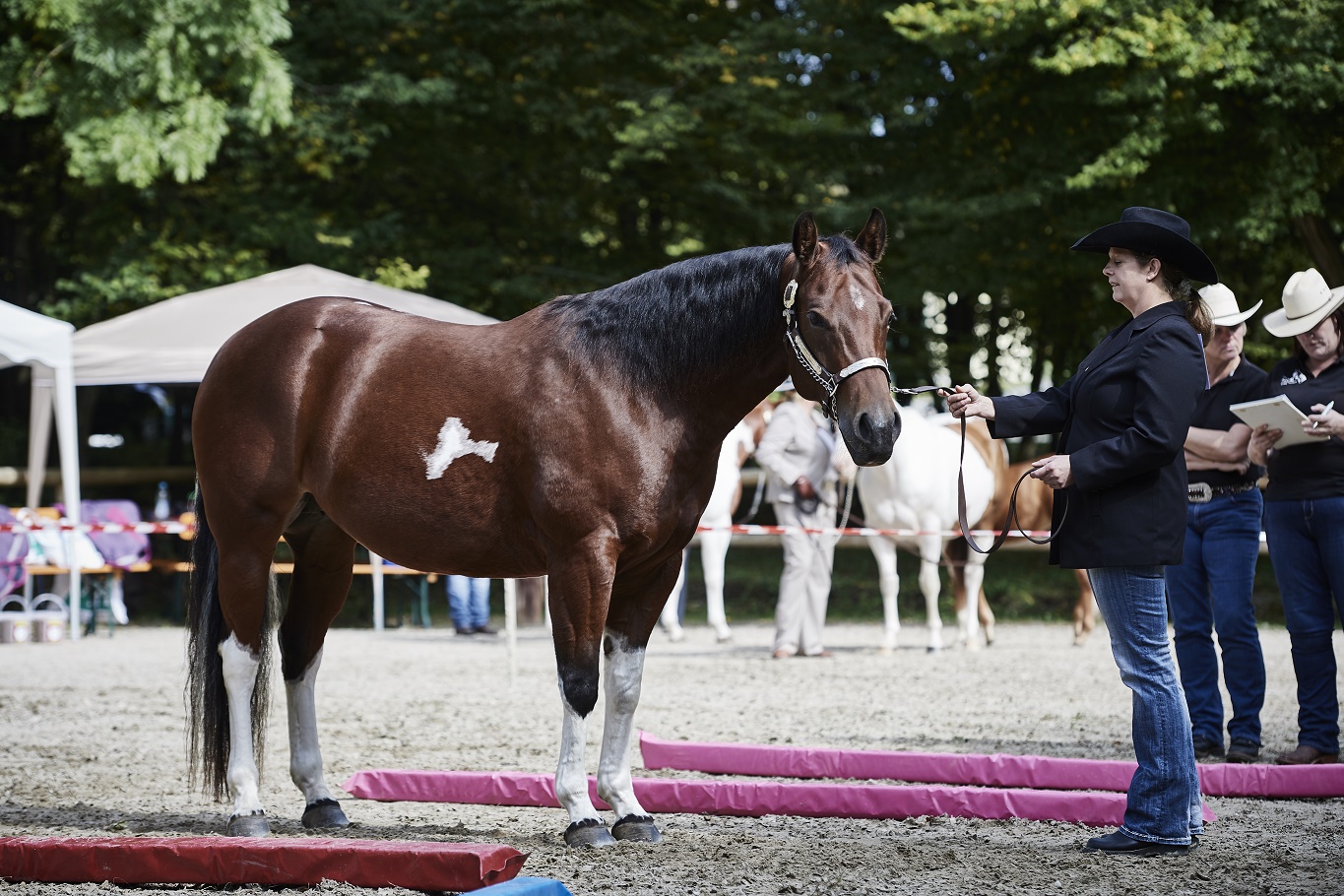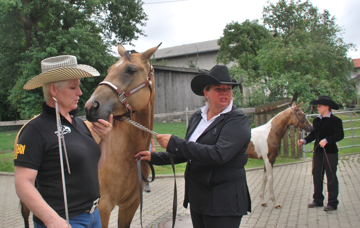 Den Anfang machten zwei Painthorse Stuten, die ins Zuchtbuch des PHCG eingetragen werden sollten. Dafür müssen die Damen auf hartem Boden vorgestellt werden, die Röhrbeine werden vermessen, die Zähne werden gecheckt……. und auch das Stockmass wird aufgeschrieben.
